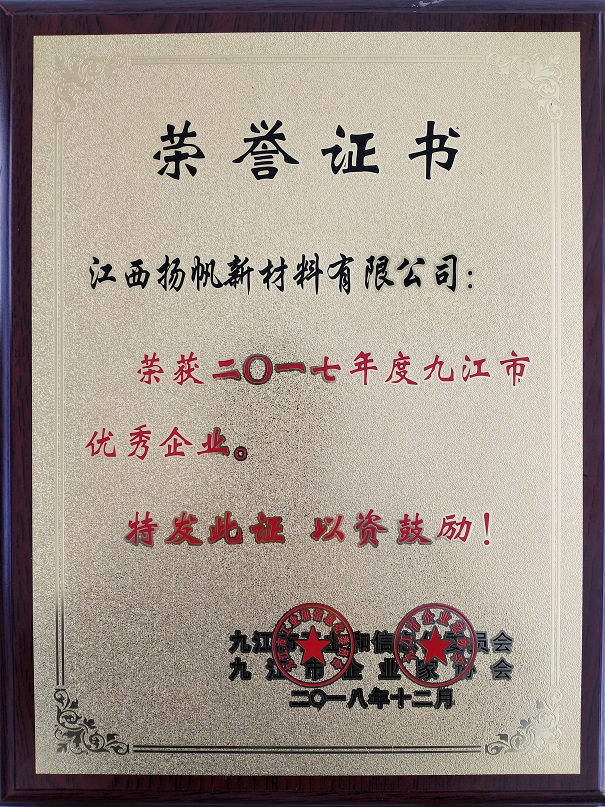 12月14日,從九江市工業(yè)和信息化委員會以及九江市企業(yè)家協(xié)會聯(lián)合主辦的“2018年度九江市企業(yè)家協(xié)會年會及頒獎大會”傳來喜訊,江西揚(yáng)帆新材公司獲評2017年度“九江市優(yōu)秀企業(yè)獎”、2017年度 “九江工業(yè)企業(yè)第22名”。